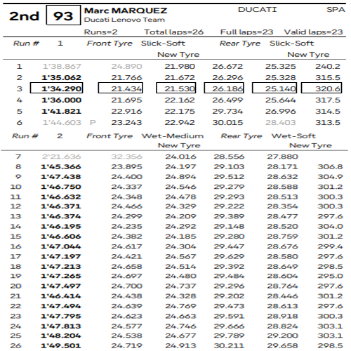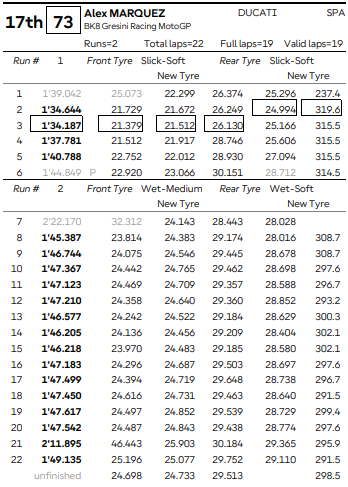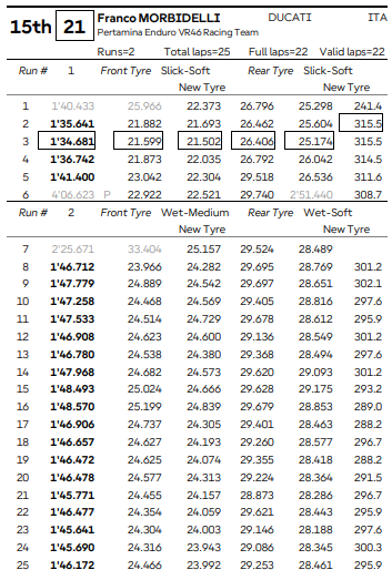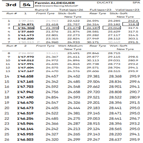 As Ducatis mostraram força mais uma vez. Além de Alex e Marc, Aldeguer e Morbidelli também estiveram entre os mais constantes. Os tempos de volta com pneus de chuva não foram os mais rápidos, mas o equilíbrio e controle em pista molhada fizeram diferença.