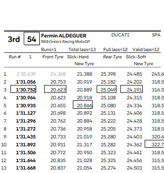 O nome que chamou atenção no cronômetro, no entanto, foi o jovem Fermin Aldeguer, da Gresini Racing. O espanhol marcou a volta mais rápida da corrida com 1’30.752, no terceiro giro. Um desempenho que mostra o potencial explosivo do piloto, que também manteve excelente regularidade com tempos quase sempre abaixo de 1’31.3. Mesmo terminando em terceiro, seu ritmo foi de ponta, e sua evolução ao longo da temporada segue impressionando.