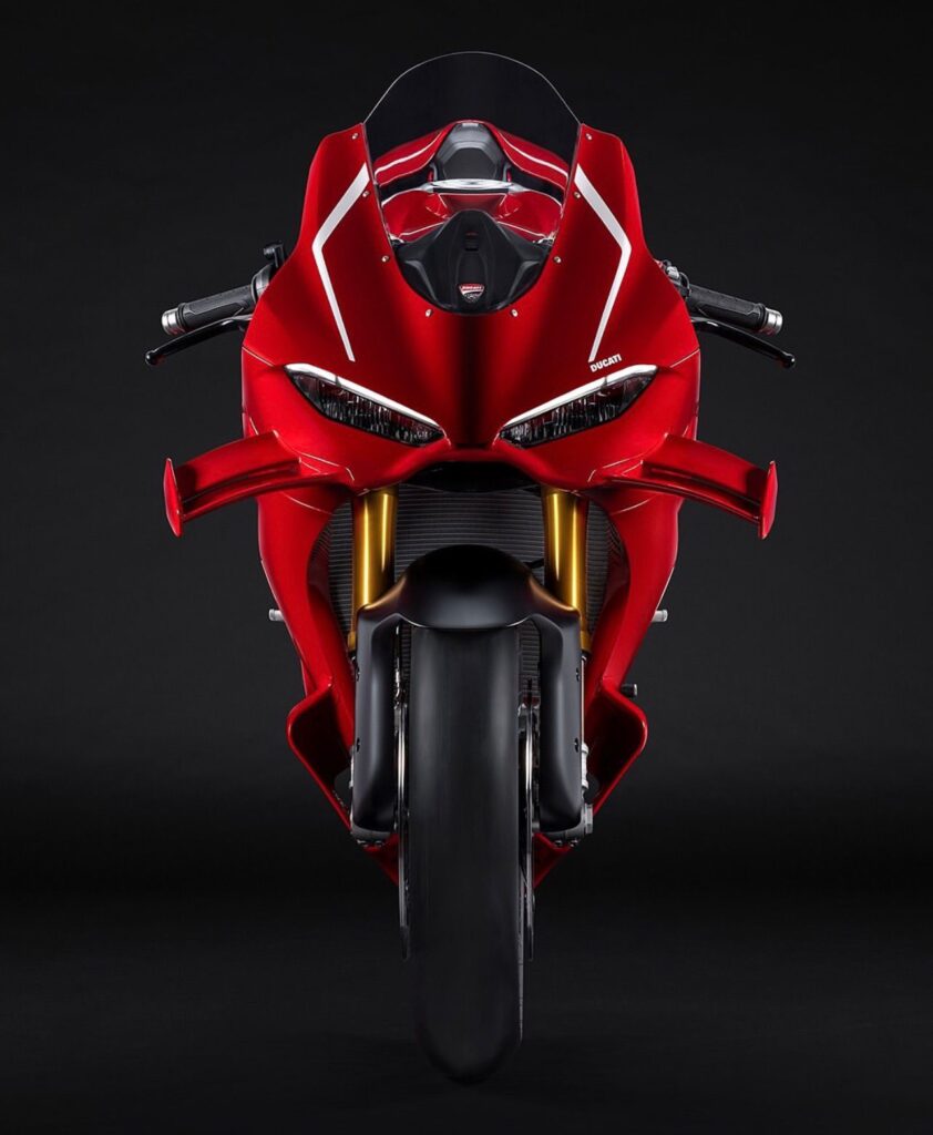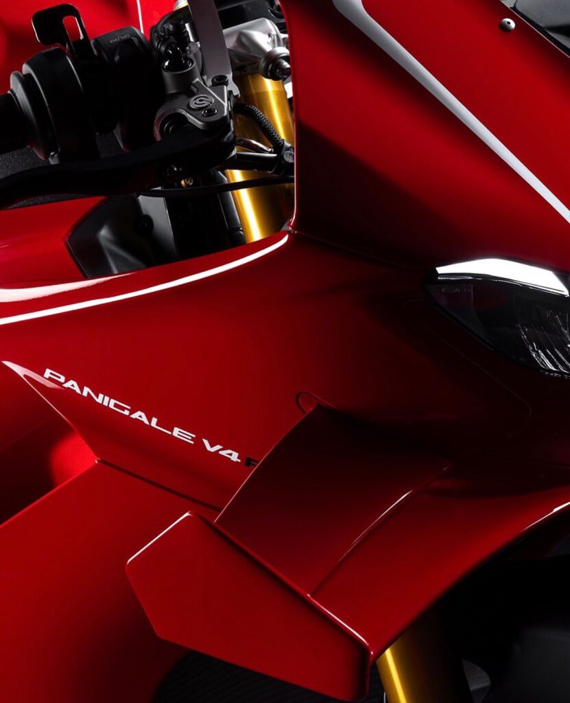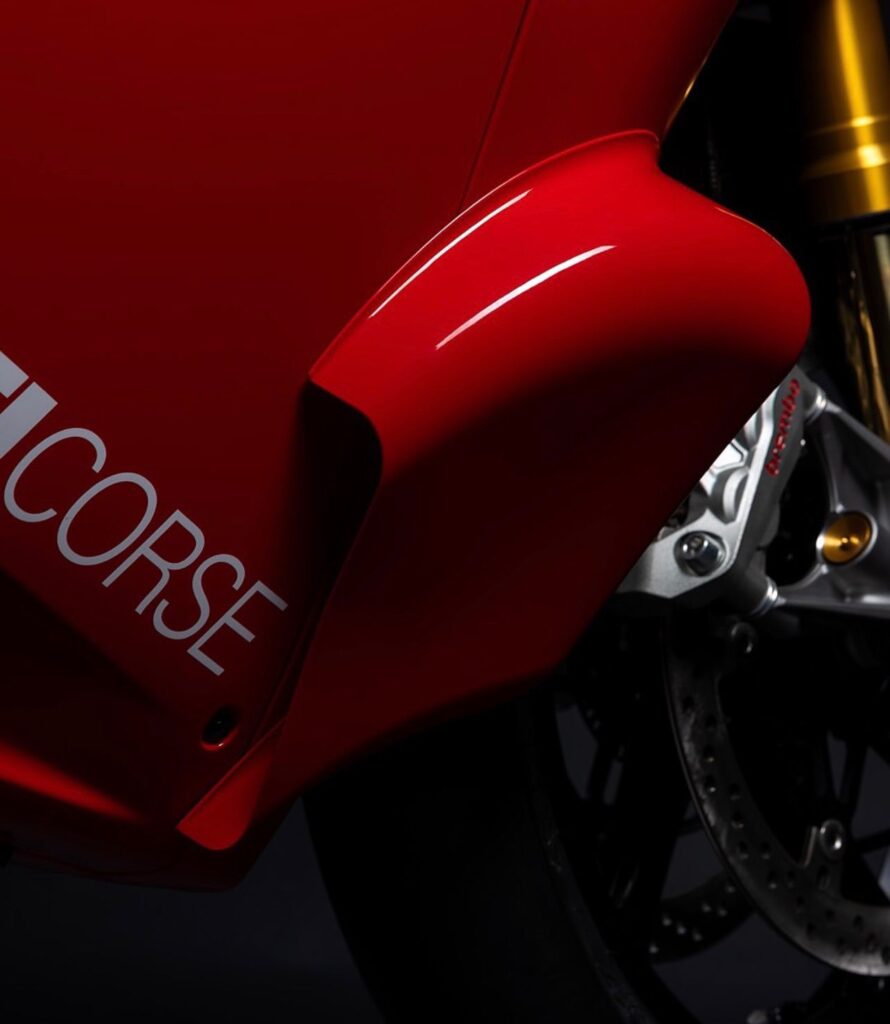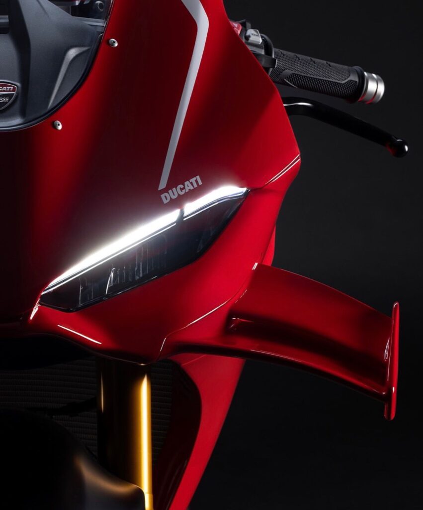 Um dos destaques da nova V4 R está na aerodinâmica. Pela primeira vez em uma moto de produção da Ducati, aparecem os corner sidepods, adotados pela marca no MotoGP em 2021. Esses elementos, junto às novas asas (winglets), proporcionam até 25% mais downforce do que a versão anterior. A 300 km/h, o ganho chega a cerca de 6 kg extras de carga na dianteira, melhorando estabilidade em frenagens de alta velocidade.