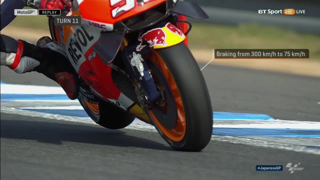 Uma MotoGP atinge com facilidade 350 km/h nas retas. No momento da frenagem, esses protótipos chegam a reduzir mais de 250 km/h em cerca de cinco segundos — algo comparável a “pisar no freio de um foguete”. A desaceleração é tão intensa que ultrapassa 1,5 g, empurrando o piloto violentamente para a frente e multiplicando o peso do corpo.