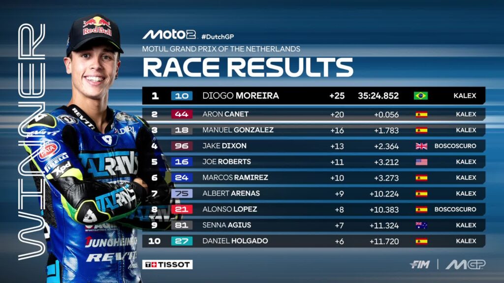 A duas voltas do fim, após uma série de investidas e uma pilotagem impecável, Diogo Moreira finalmente superou Aron Canet, reassumindo a liderança. O espanhol tentou reagir, mas a superioridade do brasileiro foi evidente. Diogo Moreira cruzou a linha de chegada em primeiro lugar, conquistando a tão sonhada primeira vitória de sua carreira na Moto2, um feito que certamente será lembrado por muito tempo no esporte a motor brasileiro.