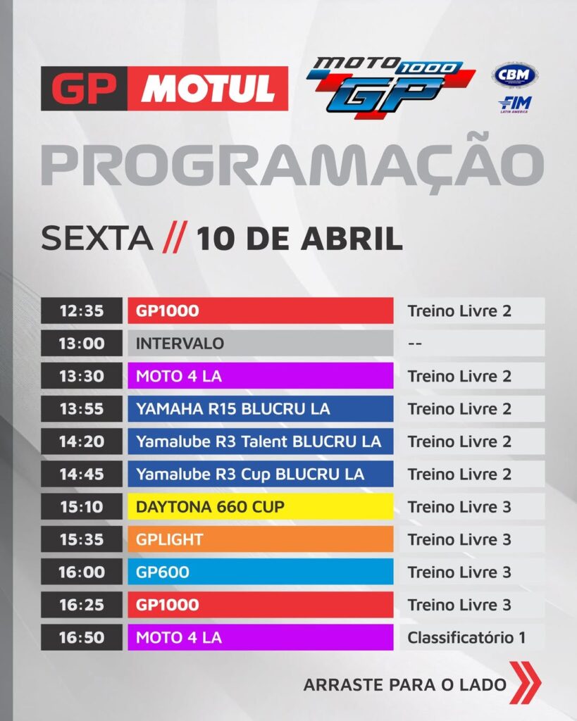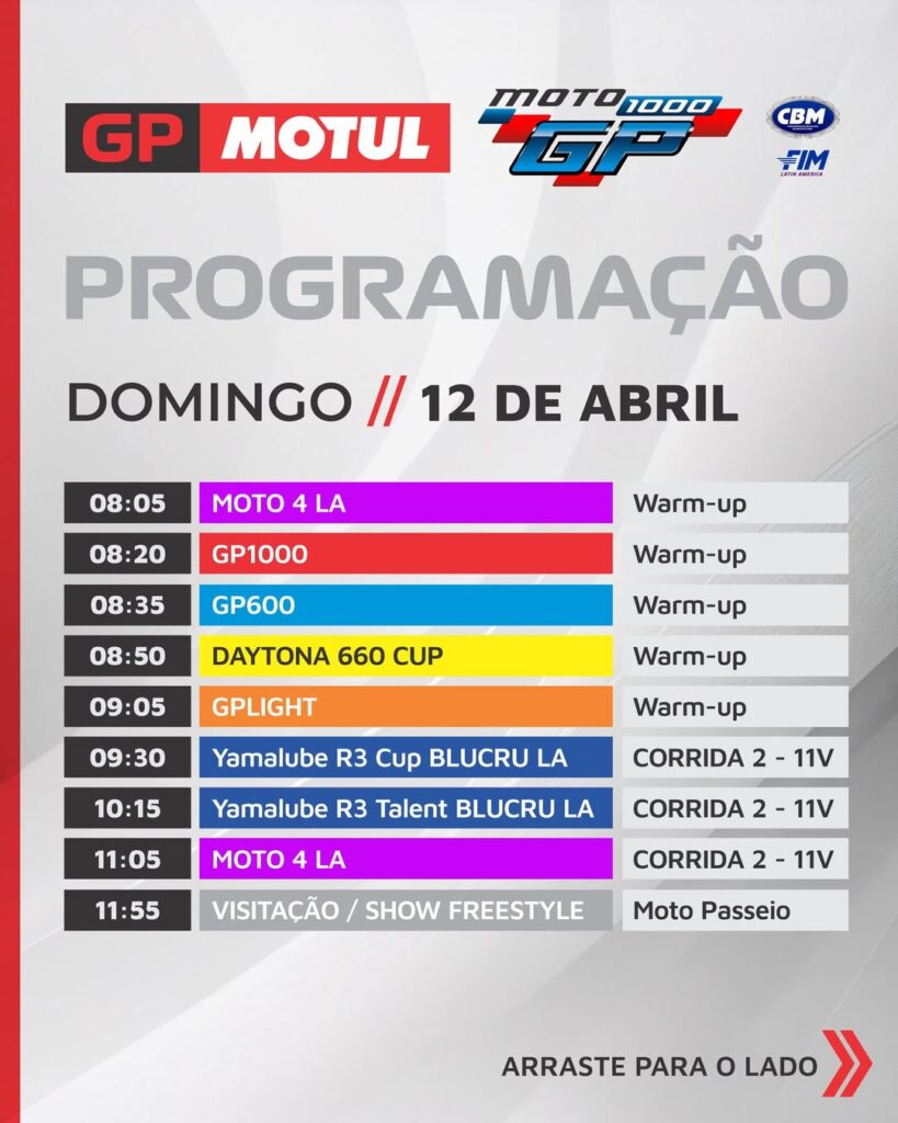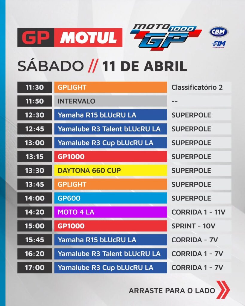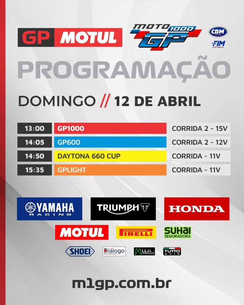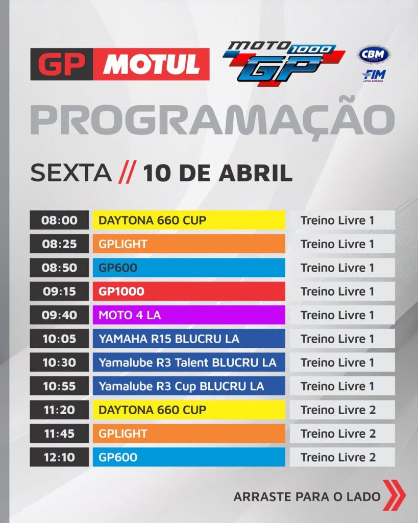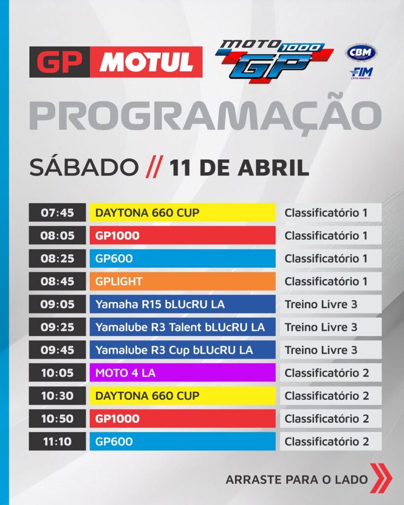 A programação começa já na sexta-feira, dia 10, com os treinos livres. No sábado, dia 11, acontecem as sessões classificatórias e as primeiras corridas de categorias como GP1000 by Motul, Yamalube R3 BLU CRU LA nas classes Cup e Talent, além da MOTO4 Latin Cup. O domingo concentra as segundas baterias dessas categorias, além das disputas da GP600, GP Light e Daytona 660 Cup. A Yamaha R15 BLU CRU LA terá corrida única no sábado.