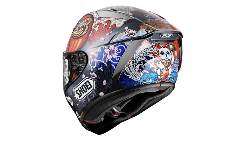 Logo após a corrida, Márquez expressou sua emoção usando um capacete com grafismo exclusivo — e agora essa peça torna-se “colecionável”: a Shoei revestiu seu modelo topo de linha X-SPR Pro com a pintura Motegi (local da prova) adotando detalhes carregados de simbolismo.
