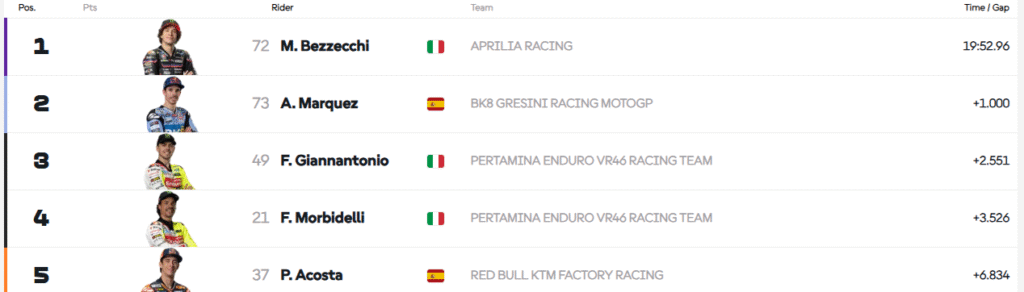 Com isso, o pódio ficou formado por Bezzecchi em primeiro, Álex Márquez em segundo e Fabio Di Giannantonio em terceiro. Franco Morbidelli terminou em quarto, seguido por Pedro Acosta e Fermín Aldeguer.