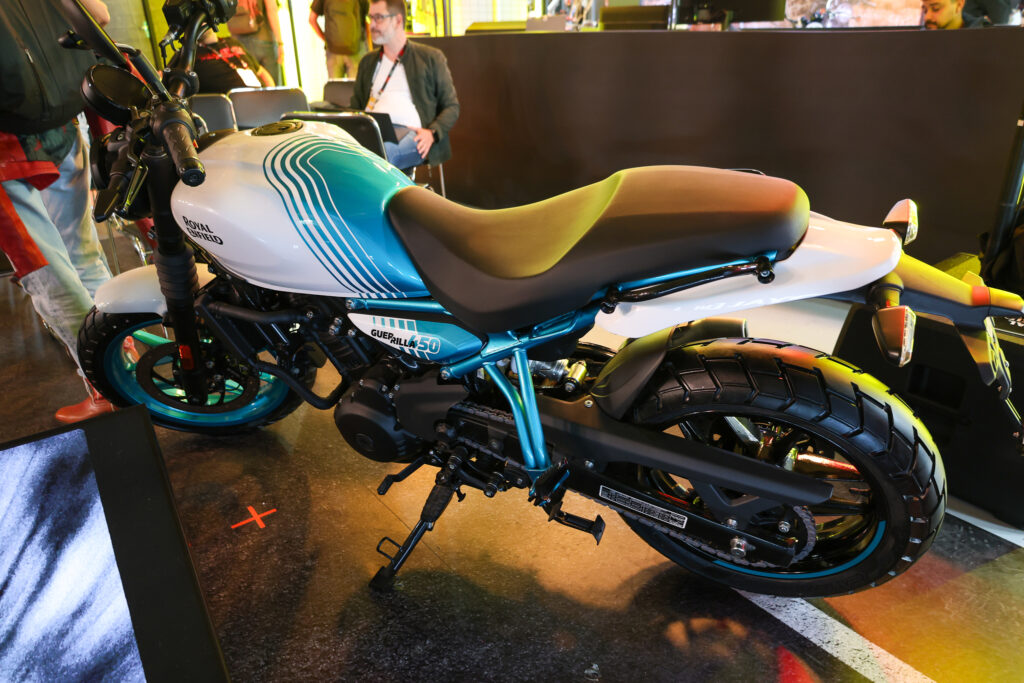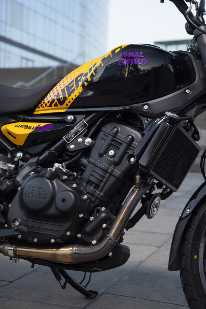Com base na plataforma Sherpa 450, a Guerrilla exibe motor monocilíndrico de 452 cc, DOHC, refrigerado a líquido, capaz de entregar cerca de 40 cv a 8.000 rpm e 40 Nm de torque a 5.500 rpm, com mais de 85% do torque já disponível a partir de 3.000 rpm — ideal tanto para o trânsito urbano como para passeios emocionantes.