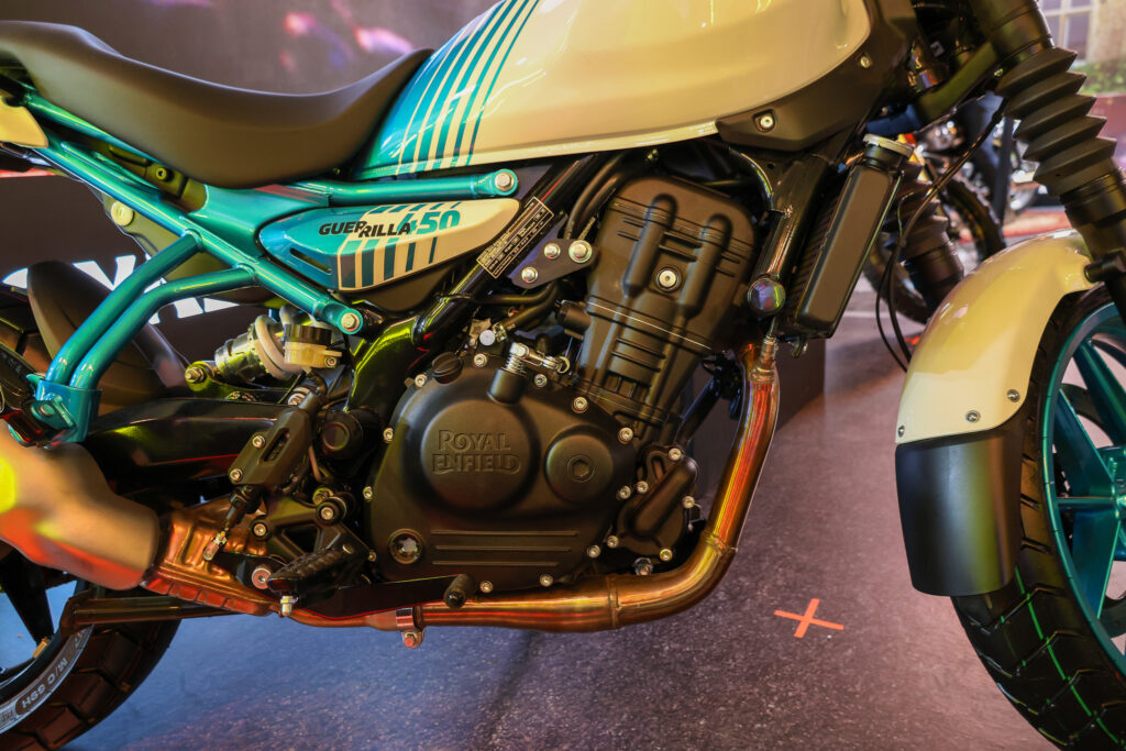 Com base na plataforma Sherpa 450, a Guerrilla exibe motor monocilíndrico de 452 cc, DOHC, refrigerado a líquido, capaz de entregar cerca de 40 cv a 8.000 rpm e 40 Nm de torque a 5.500 rpm, com mais de 85% do torque já disponível a partir de 3.000 rpm — ideal tanto para o trânsito urbano como para passeios emocionantes.