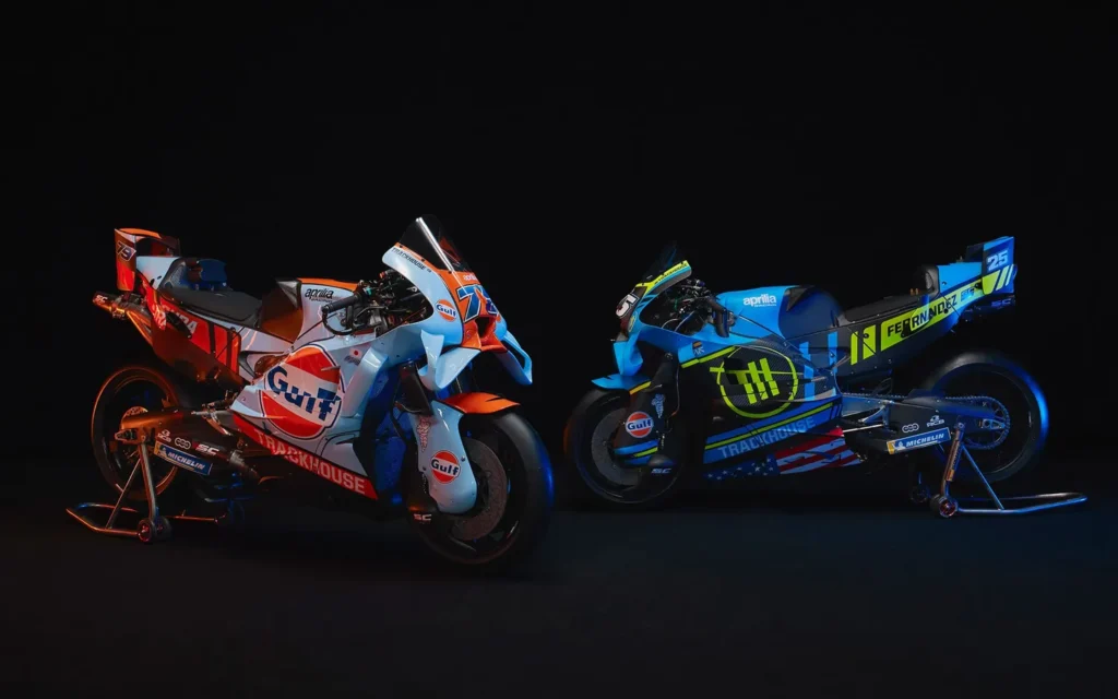 A Trackhouse MotoGP Team abriu oficialmente a temporada 2026 com a apresentação de duas pinturas distintas para suas Aprilia RS-GP26, reforçando não apenas sua identidade visual, mas também o crescimento esportivo da equipe na principal categoria do motociclismo mundial. Em seu terceiro ano na MotoGP, a estrutura americana aposta em uma evolução do seu design próprio e no retorno das icônicas cores Gulf, uma das mais emblemáticas da história do automobilismo e do motociclismo.