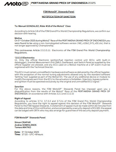 O Grande Prêmio da Indonésia de Moto2™, disputado neste domingo (5) no circuito de Mandalika, ganhou um desdobramento polêmico fora da pista. O espanhol Manuel Gonzalez (#18) foi desclassificado da prova após o Painel de Comissários da FIM MotoGP™ constatar o uso de uma versão de software eletrônico não homologada, infringindo os regulamentos técnicos da categoria.