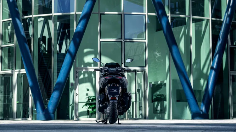 Visualmente, a NMAX 155 Tech MAX exibe um estilo sofisticado, com assento revestido em couro e costuras douradas, remetendo ao acabamento premium. A instrumentação é totalmente digital, com uma tela TFT colorida de 4,2 polegadas e navegação integrada Garmin, disponível gratuitamente em mercados selecionados.